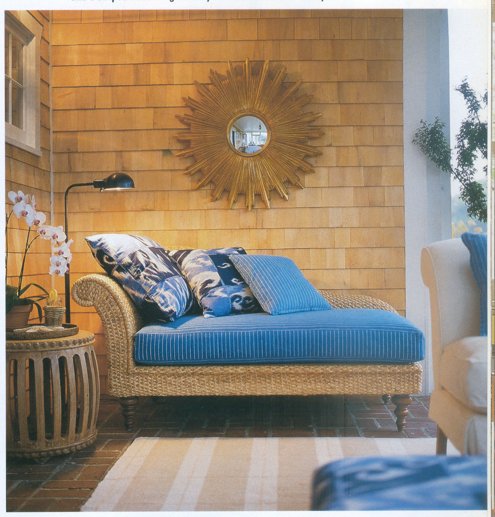 A seamless renovation of a classic cape on Martha's Vineyard. In the screen porch off the family room architects use the Carvers' Guild Sunburst mirror.