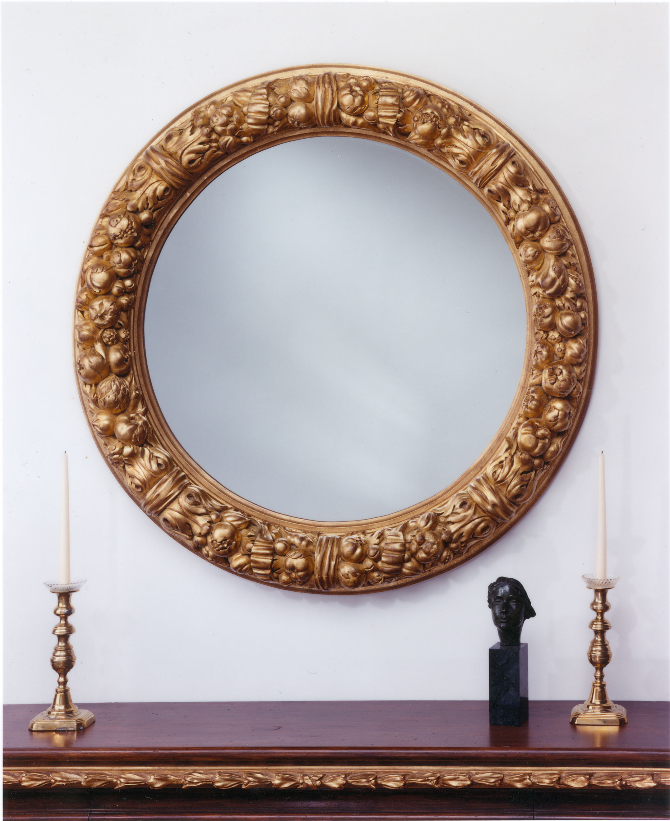Looking glasses can be especially striking in the dining room, a place where Clancey says he often hangs them. "With candlelight, and all that reflection, they help create a mood,"he says. Carvers' Guild, a Massachusetts company that offers more than three hundred mirror designs, created this handmade autumnal Newport Harvest Wreath Mirror (carversguild.com) .. It's an exact reproduction of the clerestory window surrounds in the dining room of the Breakers Mansion. built in the 1890's for Cornelius Vanderbilt in Newport, R.I.