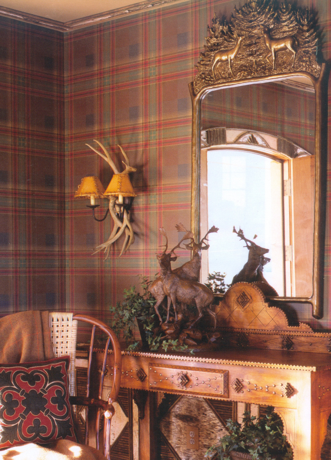 The great outdoors is reflected in one Connecticut couple's slope-side retreat in Vermont. The outdoor motif begins in the entry hall, which showcases a bronzed mirror topped with a glimmering reief of two majestic stags. Among the elements is an abundance of deer pictures, statuary and antlers all reflected in the mirror "The Deer Who Eat My Hosta" designed by Carol Canner.
