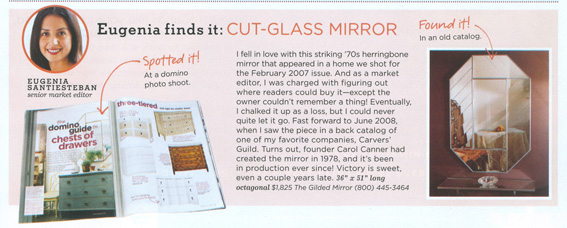 Domino's senior market editor Eugenia Santiesteban fell in love with this striking '70's herringbone mirror that appeared in a home where photos were taken for their publication. As market editor, she was charged with figuring out where the readers could buy the mirror except the owner couldn't remember where they found it. When looking in a back catalog of one of her favorite companies, Carvers' Guild, she found the mirror. Founder Carol Canner created the mirror in 1978, and it's been in production ever since!