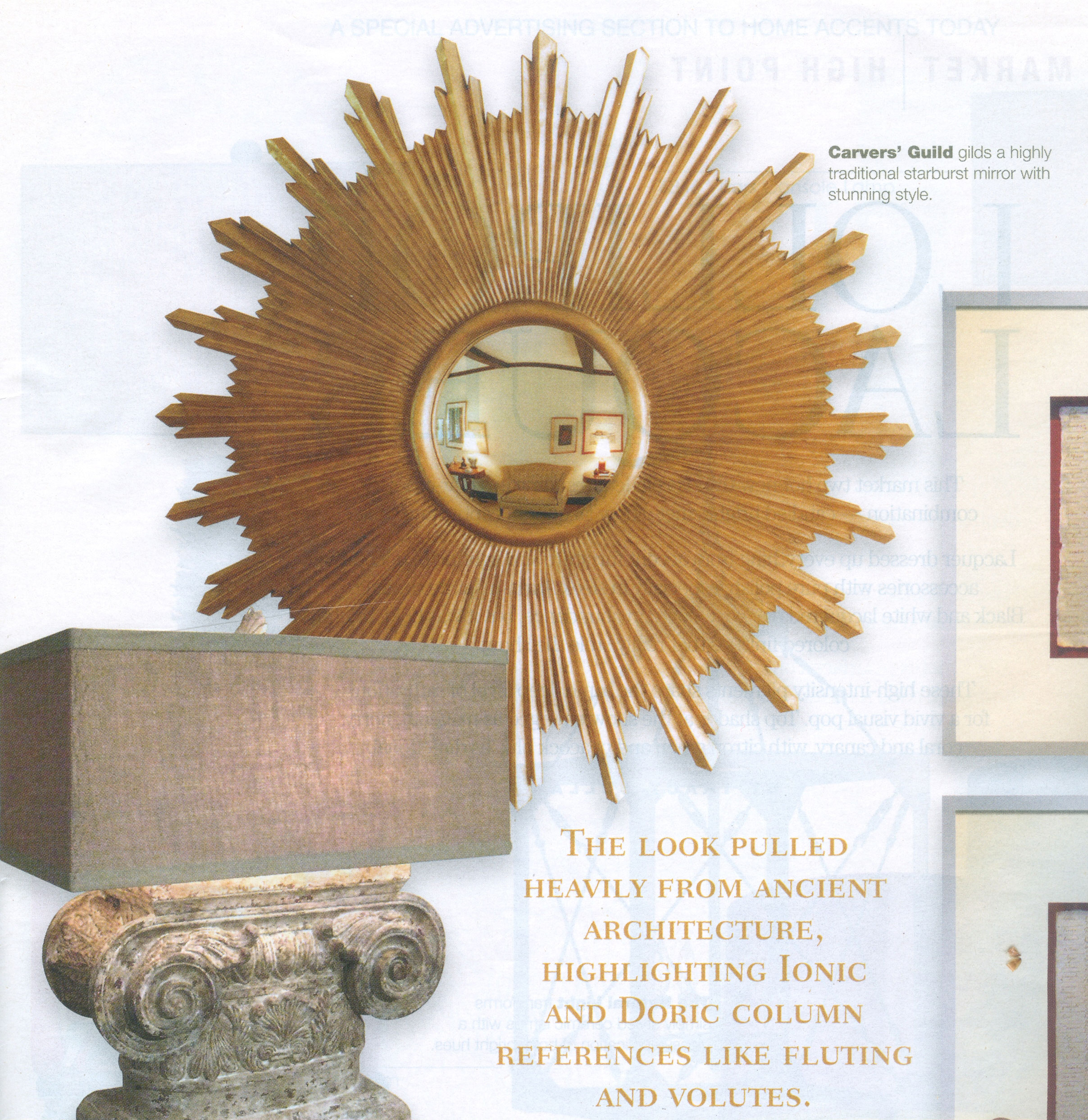 Article in Home Accents Today pictures the Carvers Guild Sunburst in "Neoclassic looks Surge Ahead in a Sea of Traditional Greek Revival"