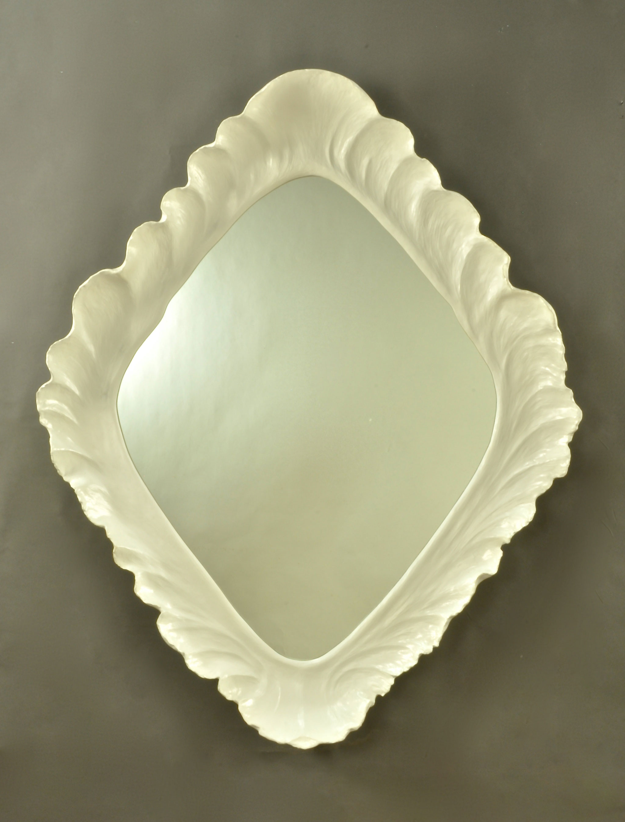 Surging with growth in it's unusual diamond shape the Zofia mirror takes the spot light in any interior. It was sculpted and designed by Carol Canner. This large mirror shown finished in both Gold Leaf and White can be ordered in any of our Carvers' Guild finishes or custom paint colors.