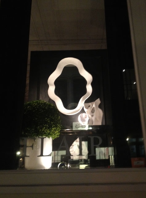 The Venus mirror was inspired by an ancient 25,000 year old four inch sculpture called Venus of Willendorf. Venus is a subliminal form from antiquity conveying fertility of body, strength of spirit and longevity of beauty. Finished in Chrome or gold Lacquer. On display in the window at Flair in NY in a white finish. Carol Canner designer/sculptor