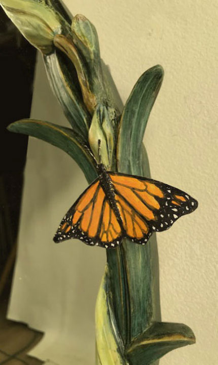 Naturalistic stalks of Lily’s in bud gracefully cross each other to create an oval mirror. This Arts and Crafts mirror design comes in gold leaf, silver leaf or hand painted. It can come with or without a sconce arm. It is alighted with a hand painted Monarch butterfly for a magical unusual mirror.