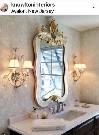 The majestic and joyful #1255 Seawaves Mirror stands proud in these gorgeous powder rooms by Knowlton Interiors. An original design scupted by Carol Canner, hand finished in sterling silver leaf with a gold wash, made by Carvers Guild in West Groton, MA, USA.