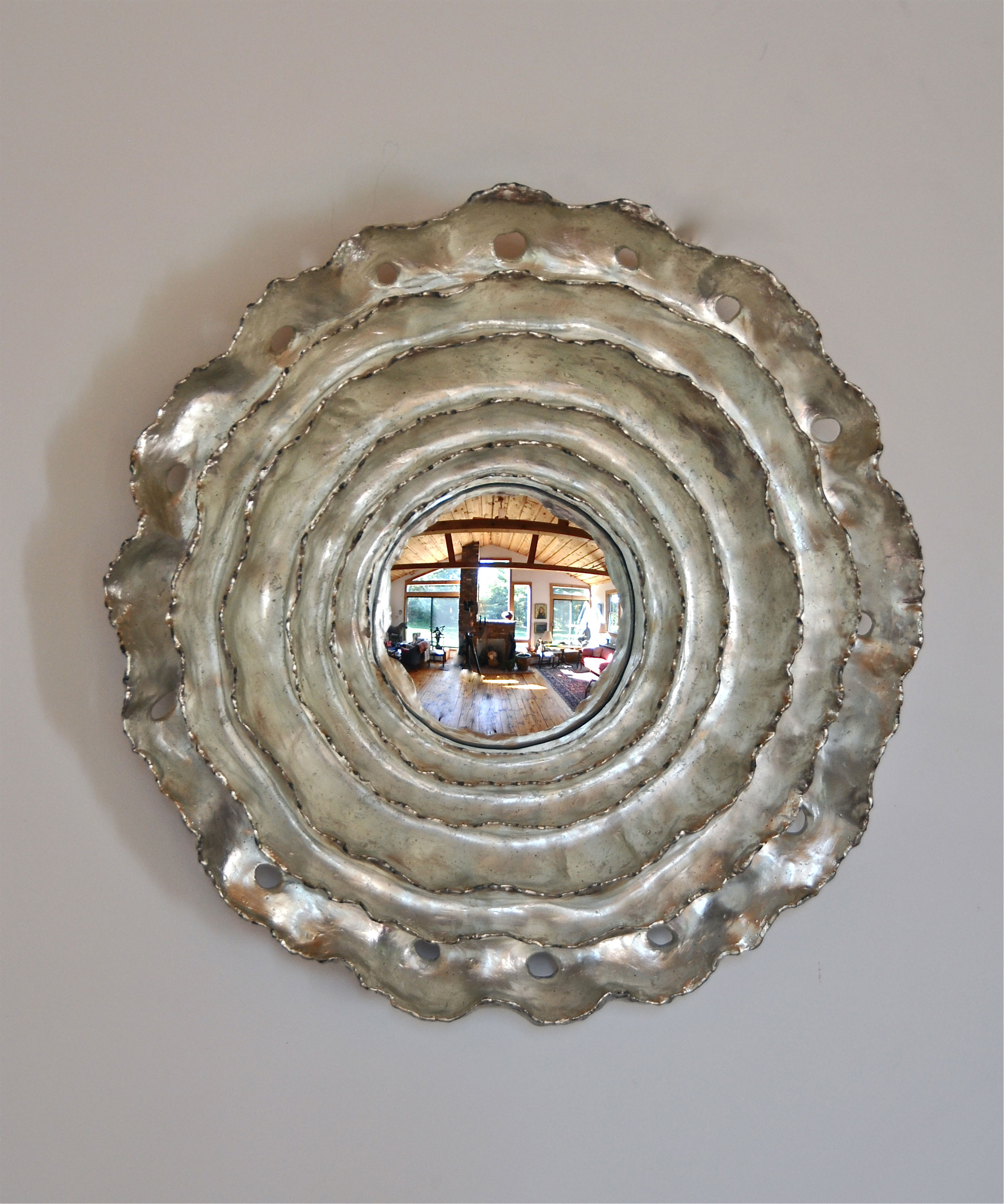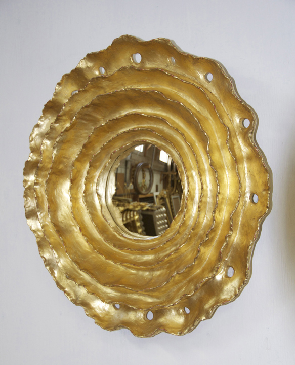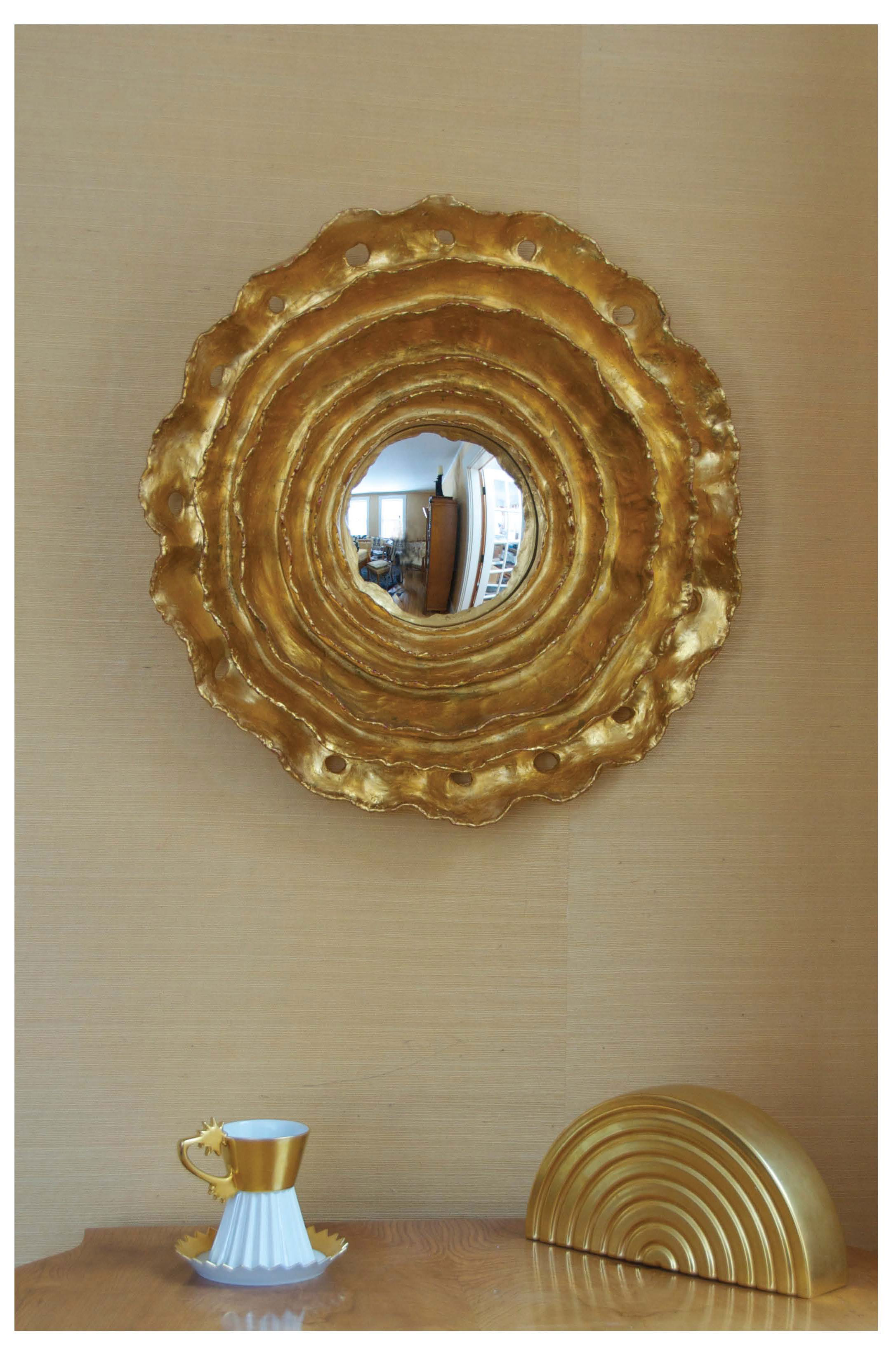 Carol Canner's inspiration for the glowing SunWave are the images of the exciting discovery of the Higgs boson. This stunning, deeply dimensional sculpture is ever so reflective in gold leaf or silver leaf with a convex mirror. Elle Decor featured the SunWave in their June 2014 issue of What's Hot.