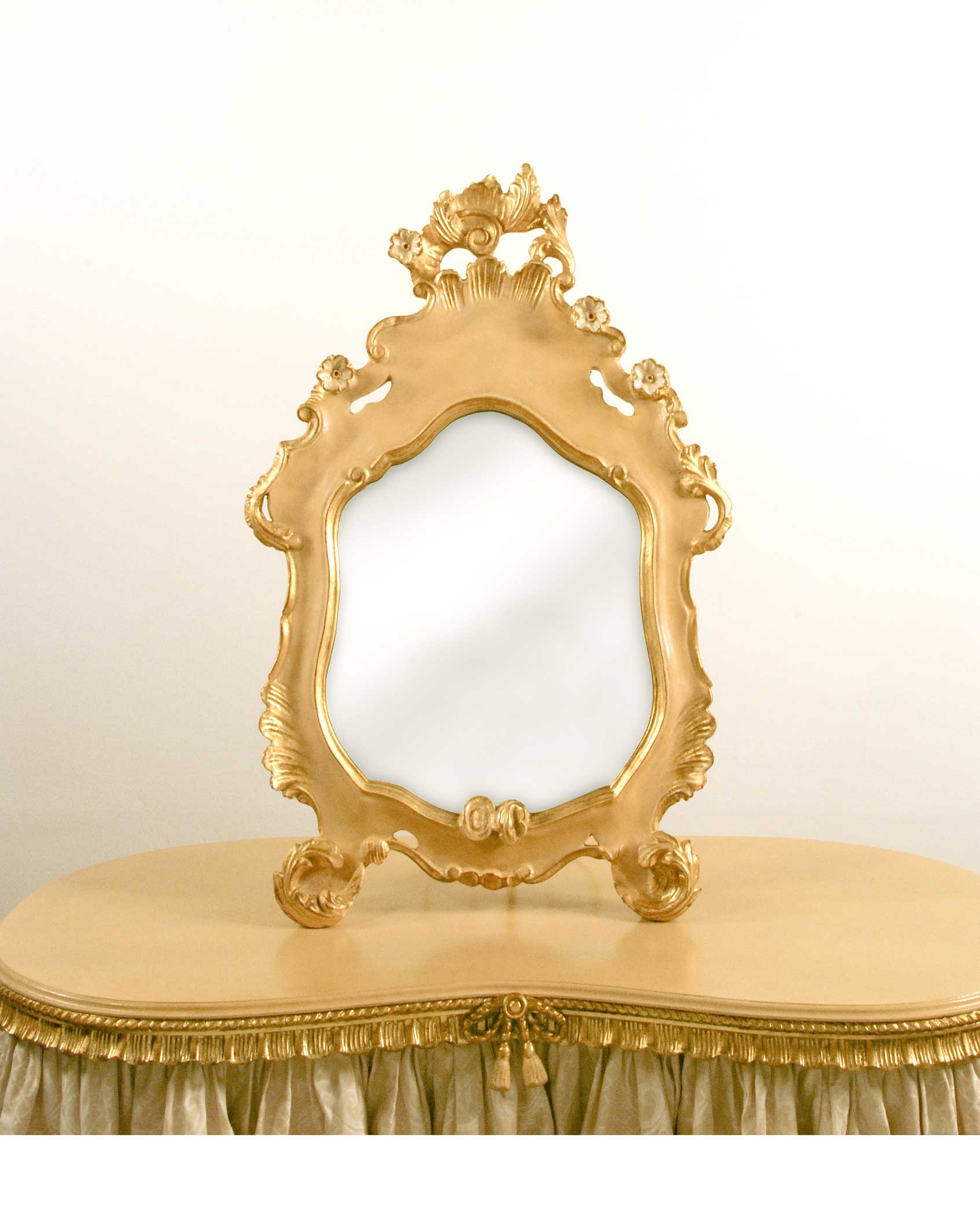 The Venezia is a gorgeous Venetian style mirror. Mrs Jack Gardner of Boston would have loved this mirror for her Venetian palace. Shown in an updated finish of gold leaf with a brilliant blue contoured panel. More subdued is the same panel in an elegant Camel.
