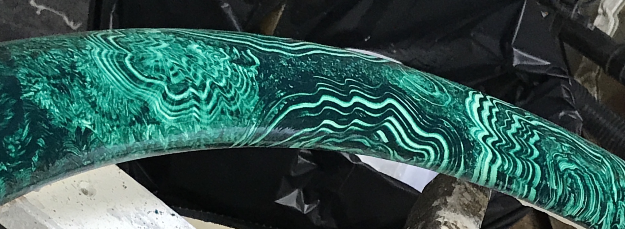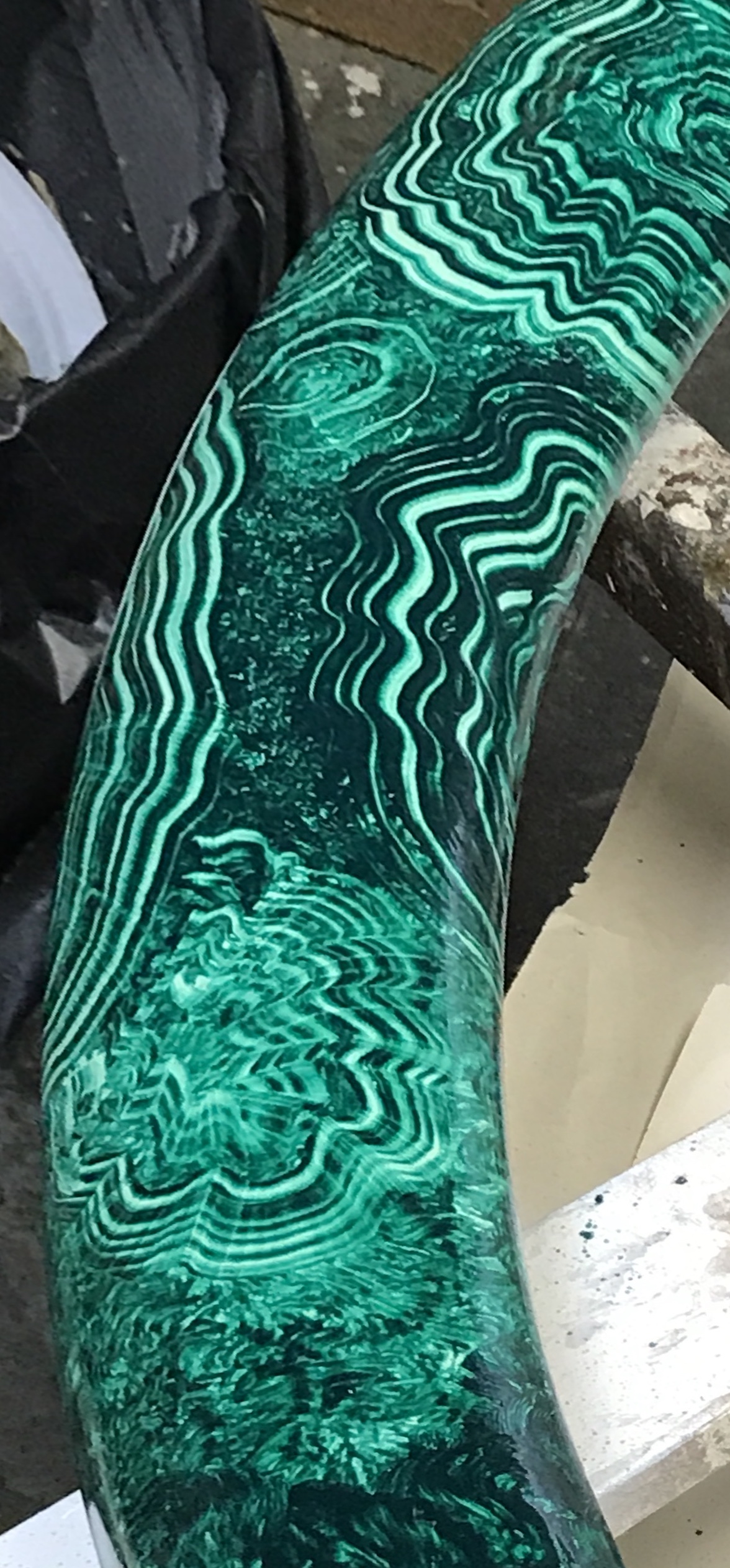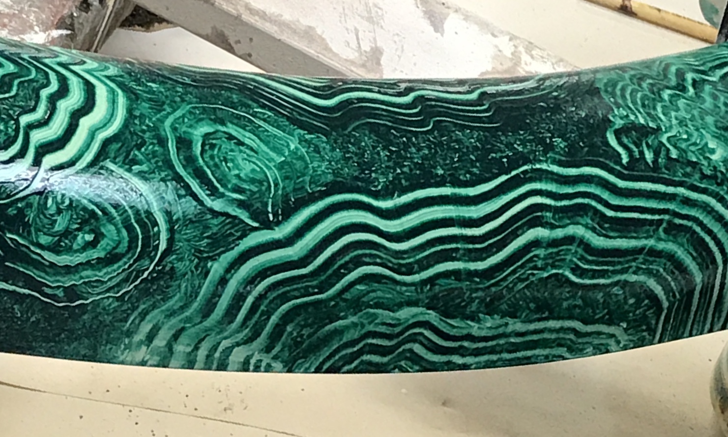 A circular mirror shown in green malachite. Also striking in a tortoise shell on gold leaf or with an unusual striped glaze finish as pictured on our #1013.