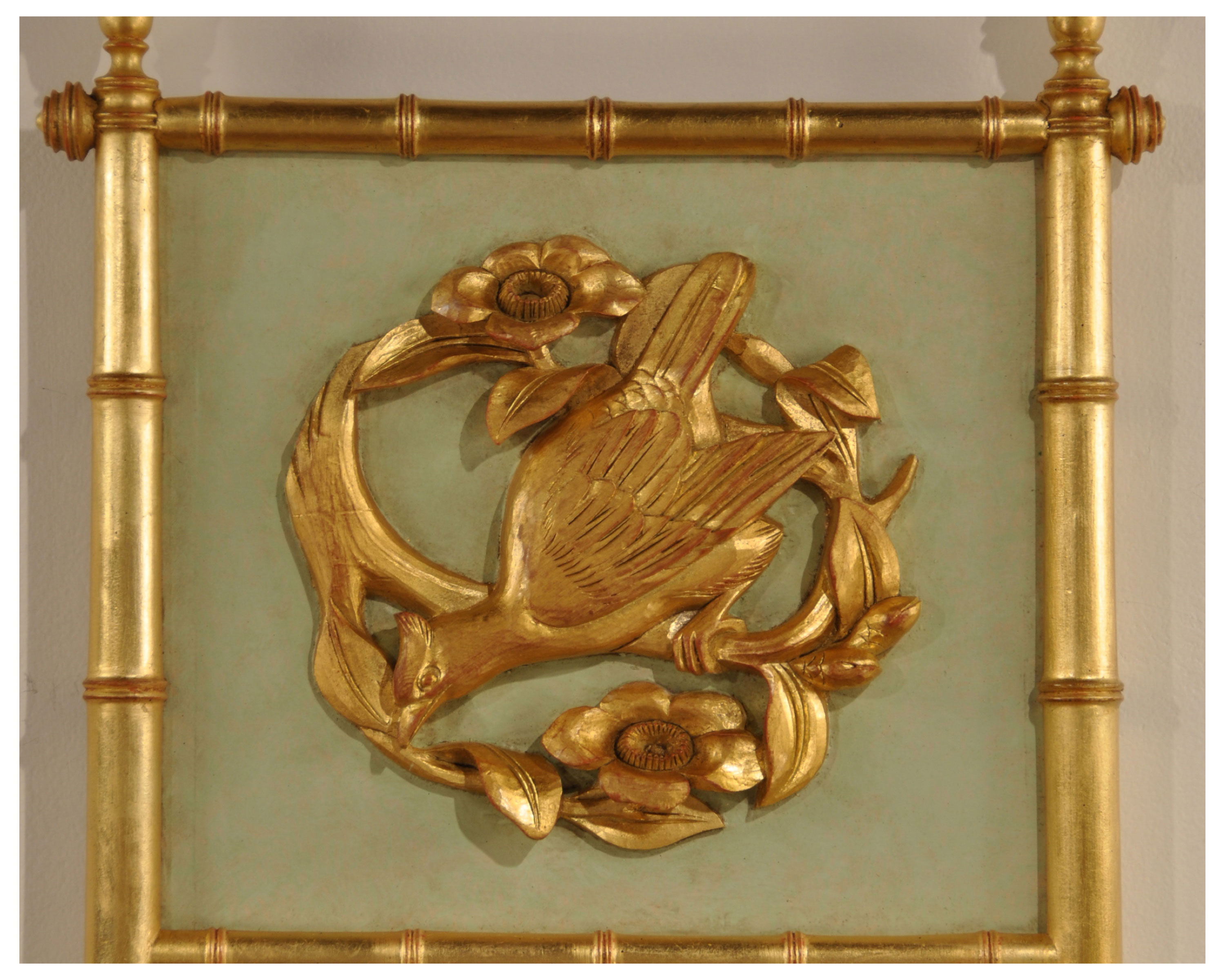 Years ago I bought three carved architectural medallions that had come from a magnificent inlayed ceiling of an ancient Chinese temple. PLUM BLOSSOMS WITH FINCHES,PEAR TREE WITH PARTRIDGE,CAT O” NINE TAIL WITH RED WINGED BLACK BIRDS they are my treasures. This show I decided to frame them into a bamboo format. They are great as a triple multi screen or in pairs or as single art pieces. The background is celadon over gold leaf peaking through, the bamboo frame and the charming bird medallions are in gold leaf. Use them all together over a buffet in a dining room, or as a pair between windows, or over a sofa, or above a chest or over a lavatory sink. They are exquisitely modeled and designed, each one different but related to the other. Imagine the ceiling that must have framed them. Now they can be enjoyed once again but at a closer view to more easily see the beauty and imagination that created them.