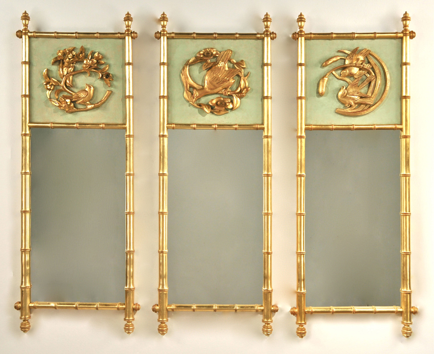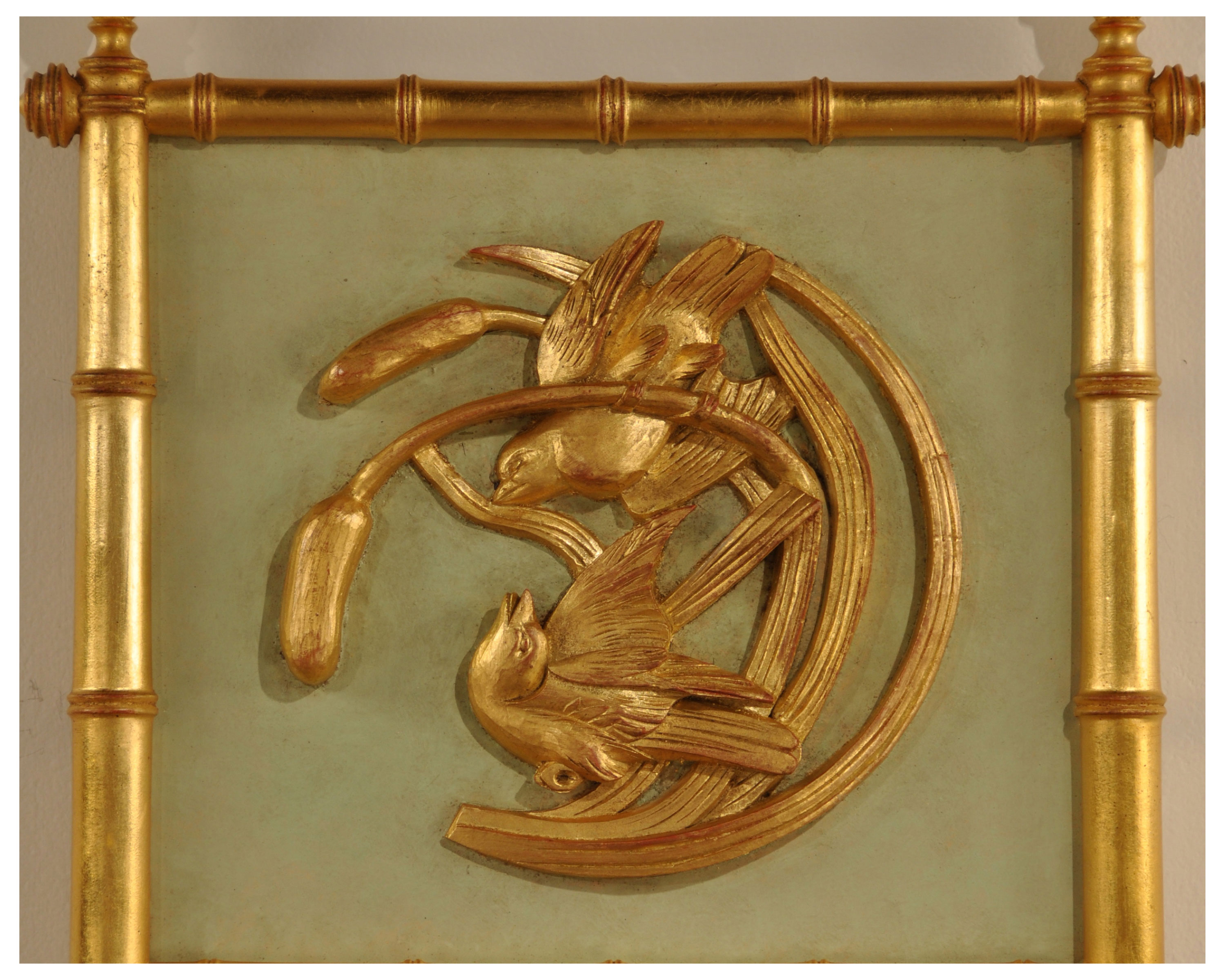 Years ago I bought three carved architectural medallions that had come from a magnificent inlayed ceiling of an ancient Chinese temple. PLUM BLOSSOMS WITH FINCHES,PEAR TREE WITH PARTRIDGE,CAT O” NINE TAIL WITH RED WINGED BLACK BIRDS they are my treasures. This show I decided to frame them into a bamboo format. They are great as a triple multi screen or in pairs or as single art pieces. The background is celadon over gold leaf peaking through, the bamboo frame and the charming bird medallions are in gold leaf. Use them all together over a buffet in a dining room, or as a pair between windows, or over a sofa, or above a chest or over a lavatory sink. They are exquisitely modeled and designed, each one different but related to the other. Imagine the ceiling that must have framed them. Now they can be enjoyed once again but at a closer view to more easily see the beauty and imagination that created them.