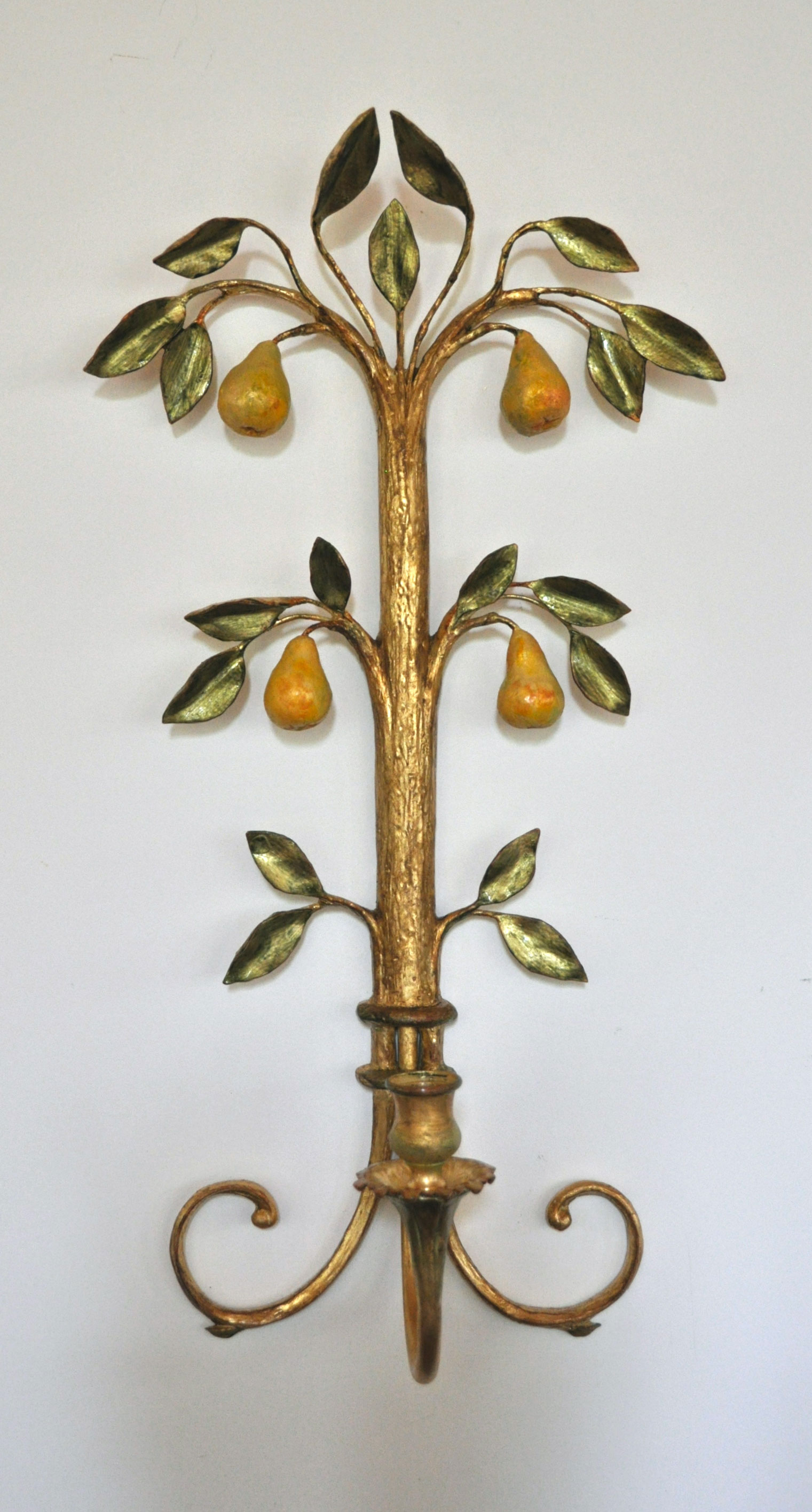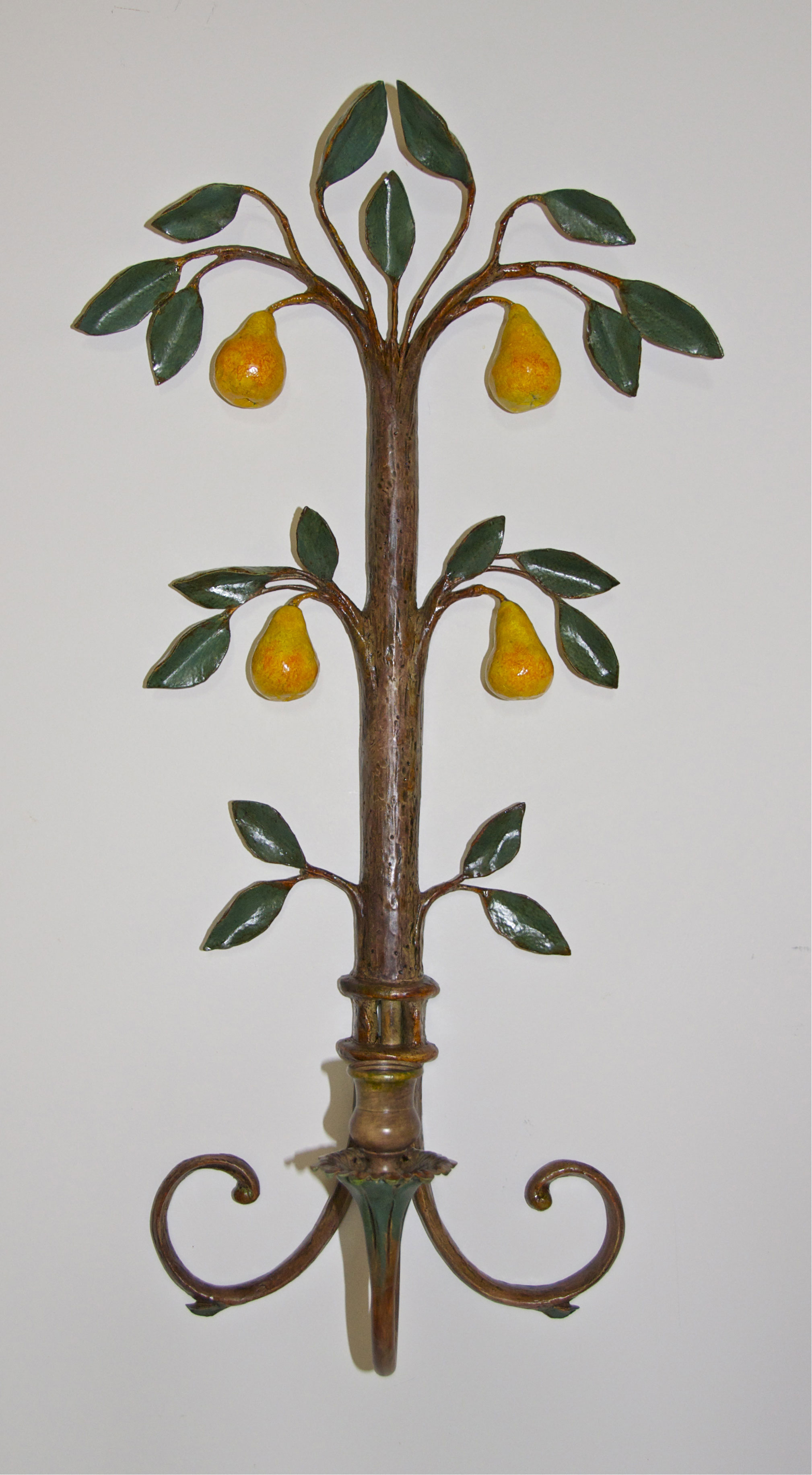 Pear Tree Sconce with it's luscious Bartlett pears ready to pick is an original Carol Canner sculpture. Available in Three finishes all Hand Painted, Antique Gold leaf with Hand Painted Glazing or in Sterling Silver leaf with gold wash. c Carol Canner Designer & Sculptor