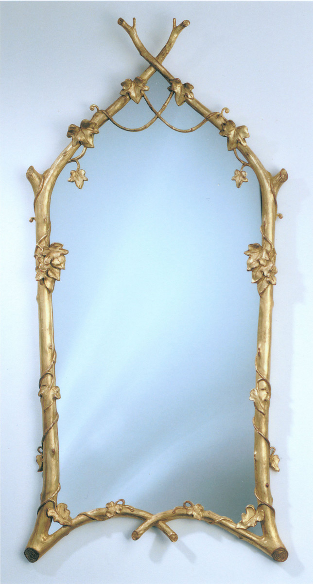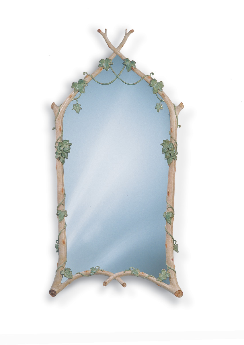 Delicate tendrils of ivy wind and climb around the Gothic arched twig frame in Carol Canners Twig & Ivy, a fantastical synthesis of natural elements with an historic architectural form. The delicately hand painted finish has a casual freshness while the Sterling Silver leaf with gold wash finish creates a stunning formal effect. Be sure to find the ladybug before she flies away home. The Twig & Ivy is also enchanting in all gold leaf with an antique patina.
