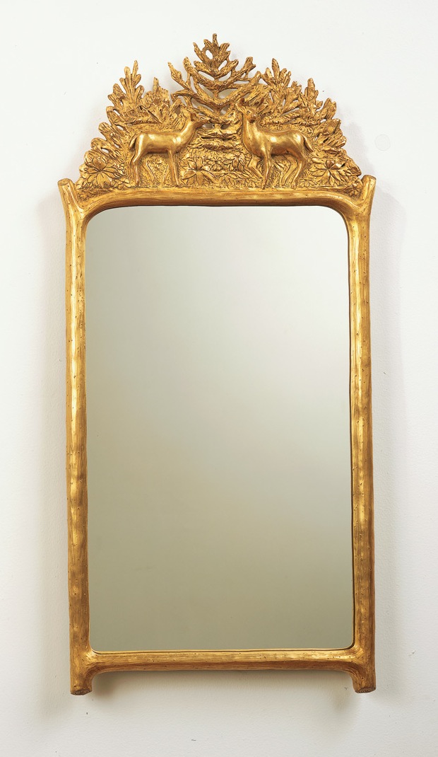 An adorable piece, two fawn are nestled into their wooded habitat. The doe grazes while the buck keeps watch. The open work in the pines adds to the youthful airy atmosphere. This is a sketch made for the larger piece #1165. Shown in a Bronze finish, its also very deer in an Antique Gold Leaf, Sterling Silver Leaf, or Nickel finish. Carol Canner is the designer and sculptor of this mirror.