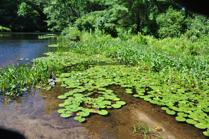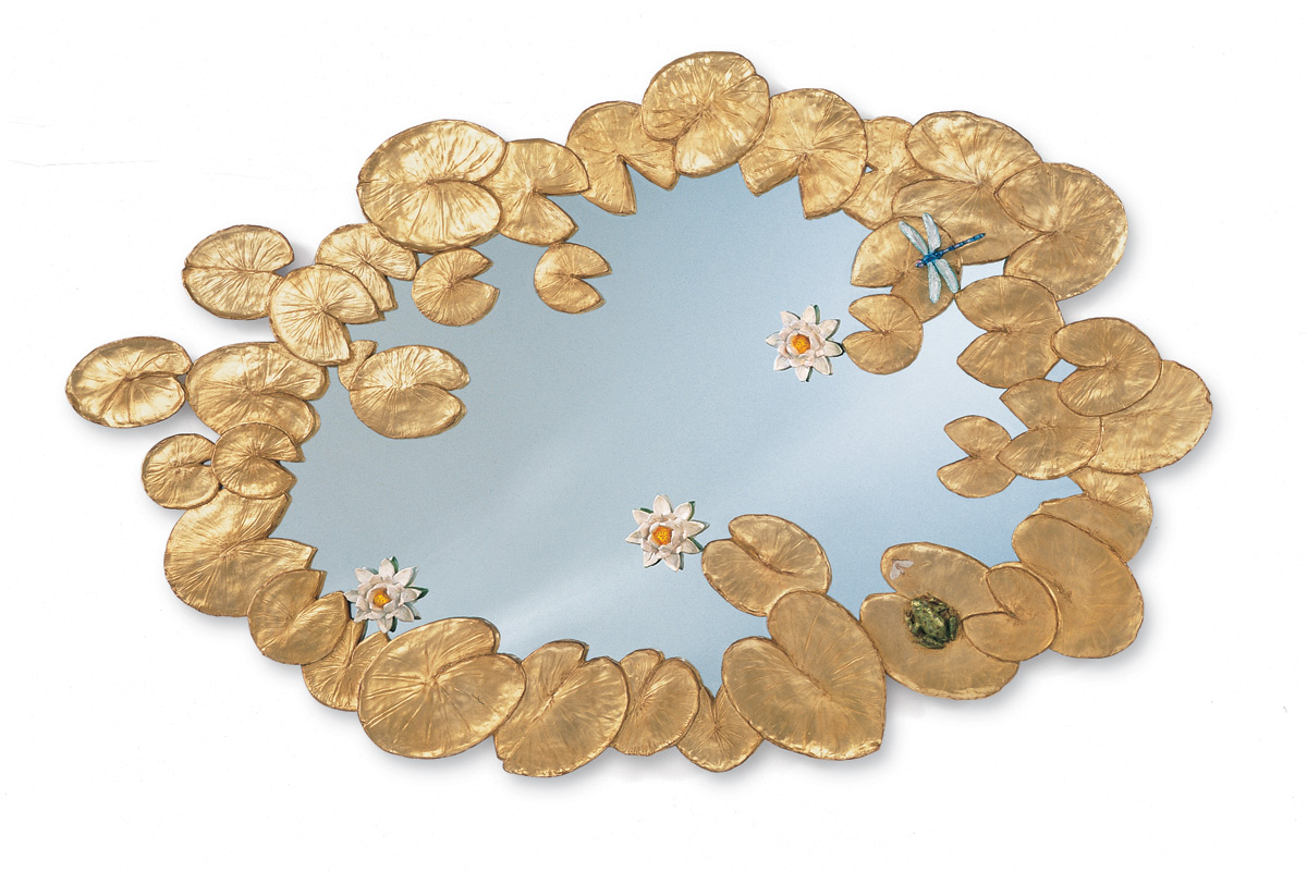 A spontaneous grouping of overlapping water lily leaves forms a floating surround for this serene reflective pool. A truly unique and sensational Carol Canner design, Water lilies is a moment captured in time. Witness the dragonfly alit on a leaf, the frog preparing to pounce on a water bug and the fully sculpted lilies opening to the sun. A layered hand-painted finish further evokes shimmering reflections of light and water. Our antiqued gold leaf finish suggest a Grecian necklace of golden leaves, bejeweled by the hand painted dragonfly, flowers and frog.