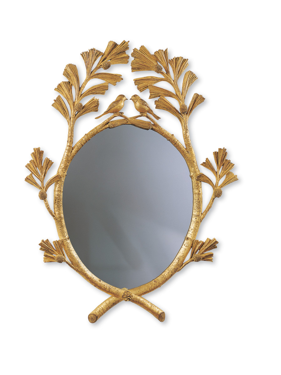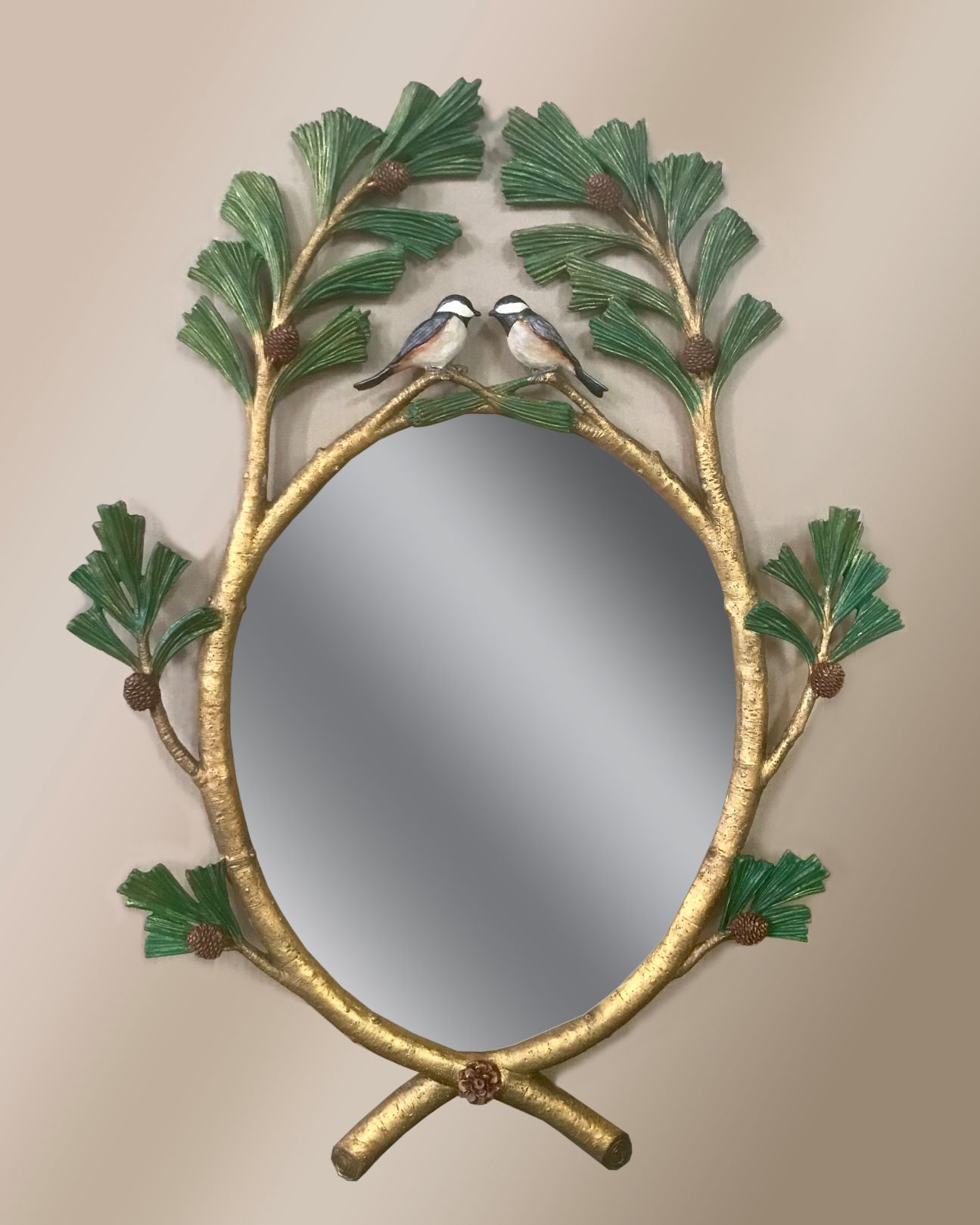Arching pine boughs form an intimate arbor for a pair of love struck chickadees in this exquisitely sculpted Carol Canner design. The antique gold leaf finish creates an Arcadian fantasy of this sylvan piece. Also wonderfully naturalistic in our hand painted finish.
