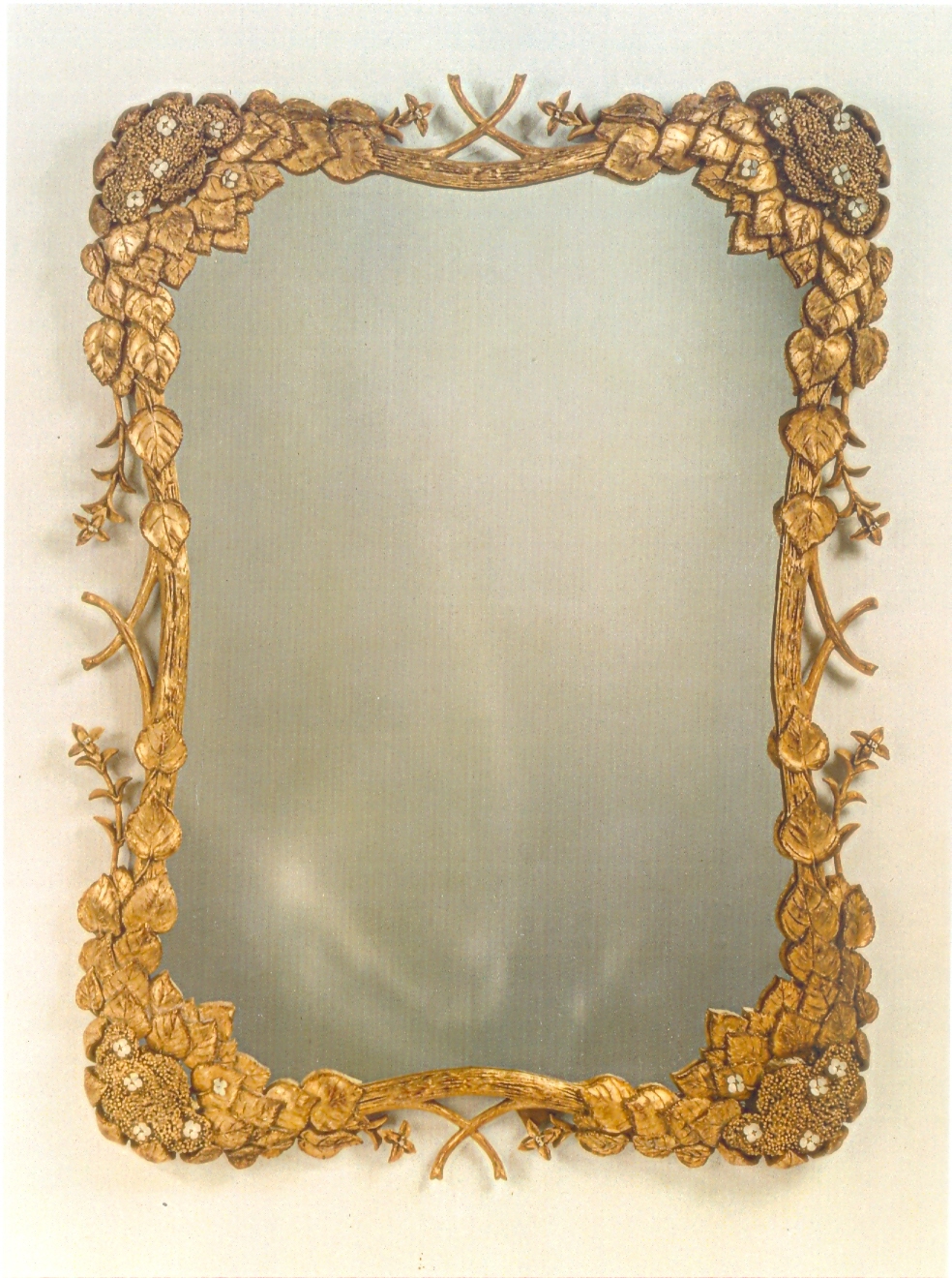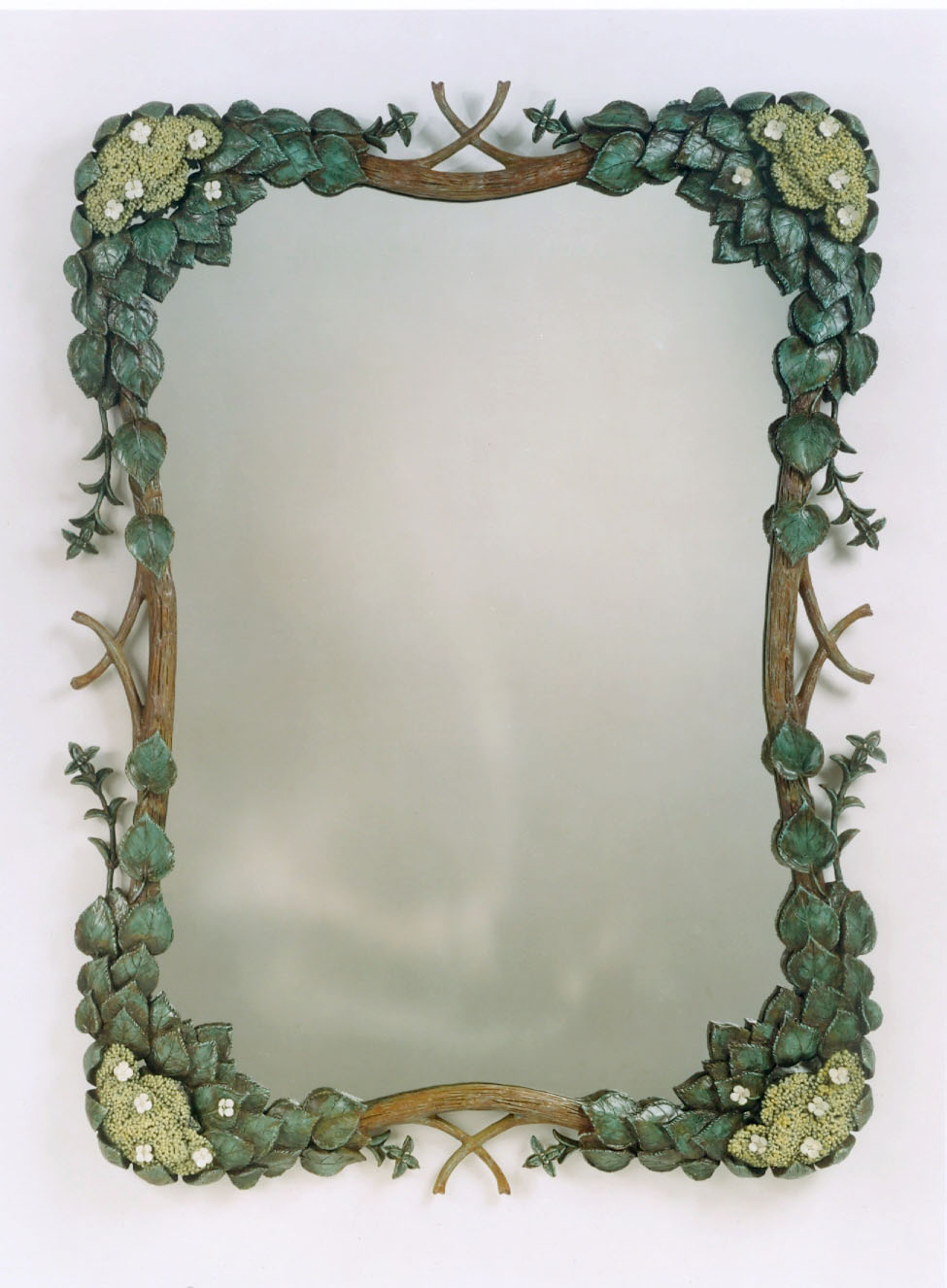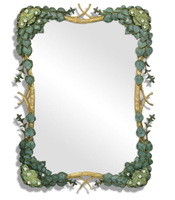 On a garden tour Carol Canner came upon a wall of Climbing Hydrangeas. She was smitten and created this mirror to express the beauty of this gorgeous cascading vine. Shown in Nickel it can also be ordered in all hand painted or in gold leaf with creamy white hand painted flowers and touches of green.