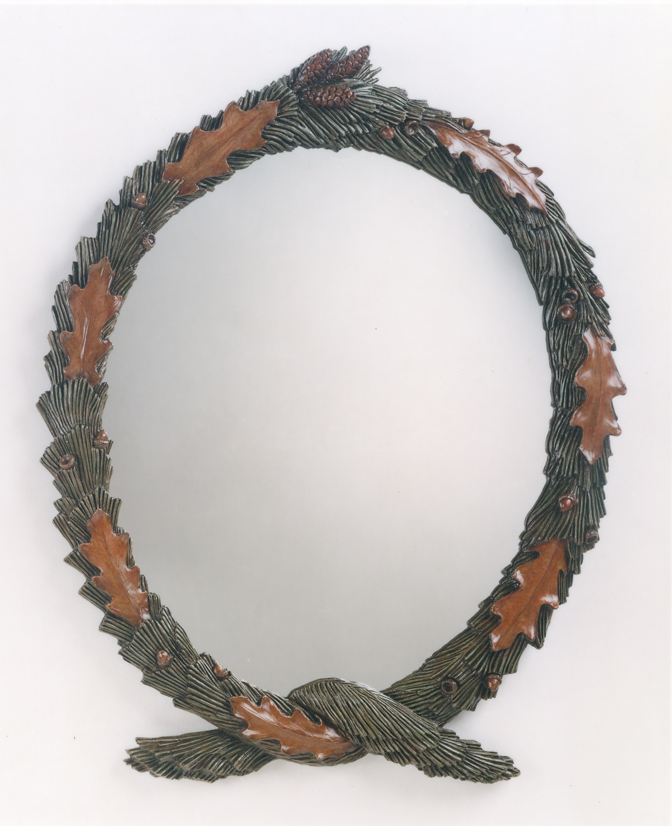 Fully realized acorns and leathery oak leaves playfully surround a wreath of white pine needles. This festive Carol Canner design is crossed at the bottom and crowned by a trio of pine cones. In the Hand Painted finish the leaves and acorns are a rich burnt sienna, echoing the autumn oak tree and complementing the soft green of the pine. An Antique Gold Leaf Finish turns it into a classic.