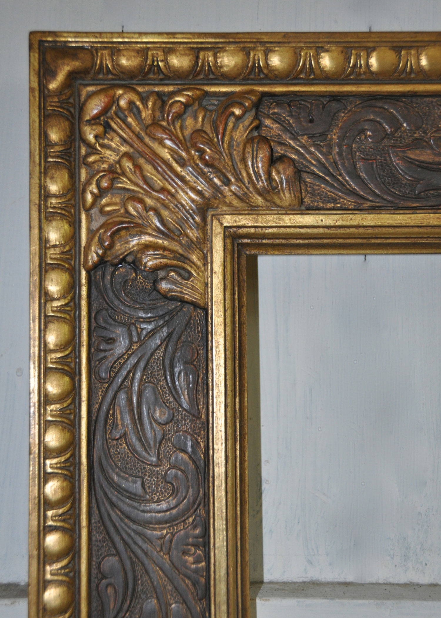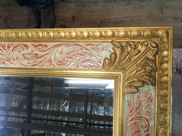 A surround of delicate low relief acanthus leaves is reminiscent of an embossed tapestry in this refined piece. An egg and dart repeat adorns the outer edge. The antique gold leaf finish is further embellished by a beveled mirror. The alternate picture is this frame done with the panel in our Ancient Oriental finish.