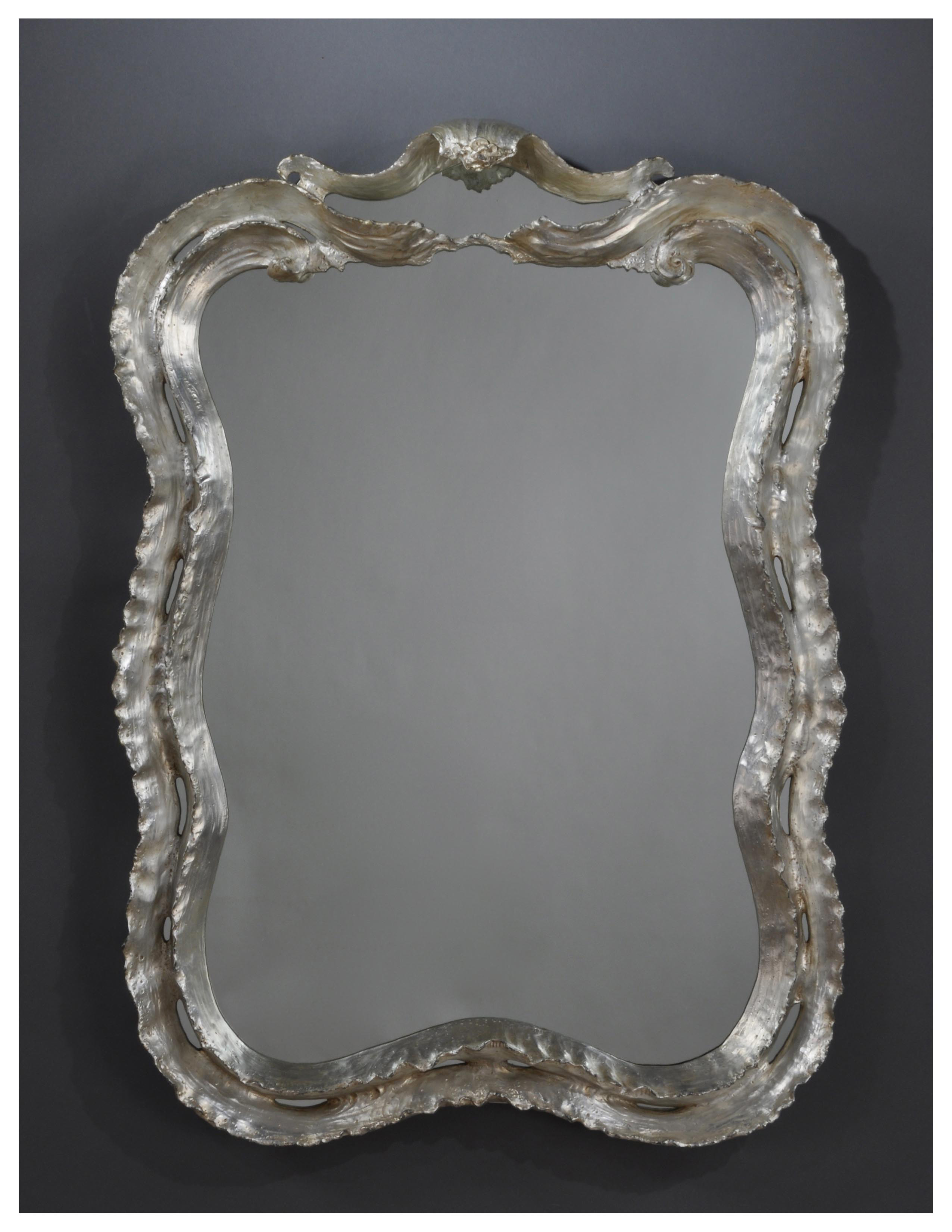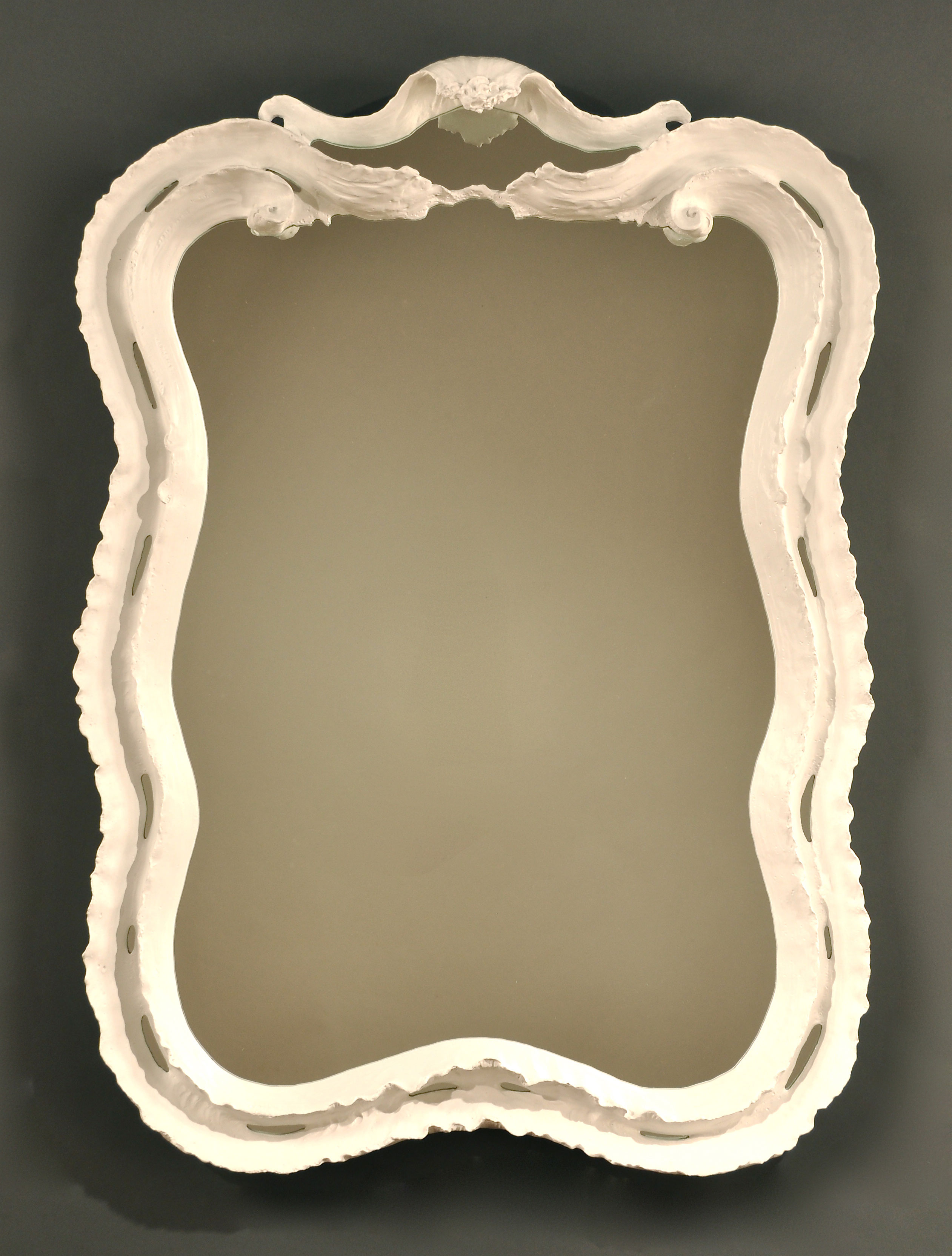 Carol Canner was chosen as one of three finalists for the Pinnacle Award in Accessories from the American Society of furniture Designers for her design of the New Wave mirror. This original sculpture by Carol Canner has a lively double wave surround and a scrolling cresting top wave. Little openings between the waves suggest fish as the mirror peeks through. In a gesso white finish it’s a contemporary art piece. In silver leaf it is cool and watery. In Gold it shimmers like the sun on water.