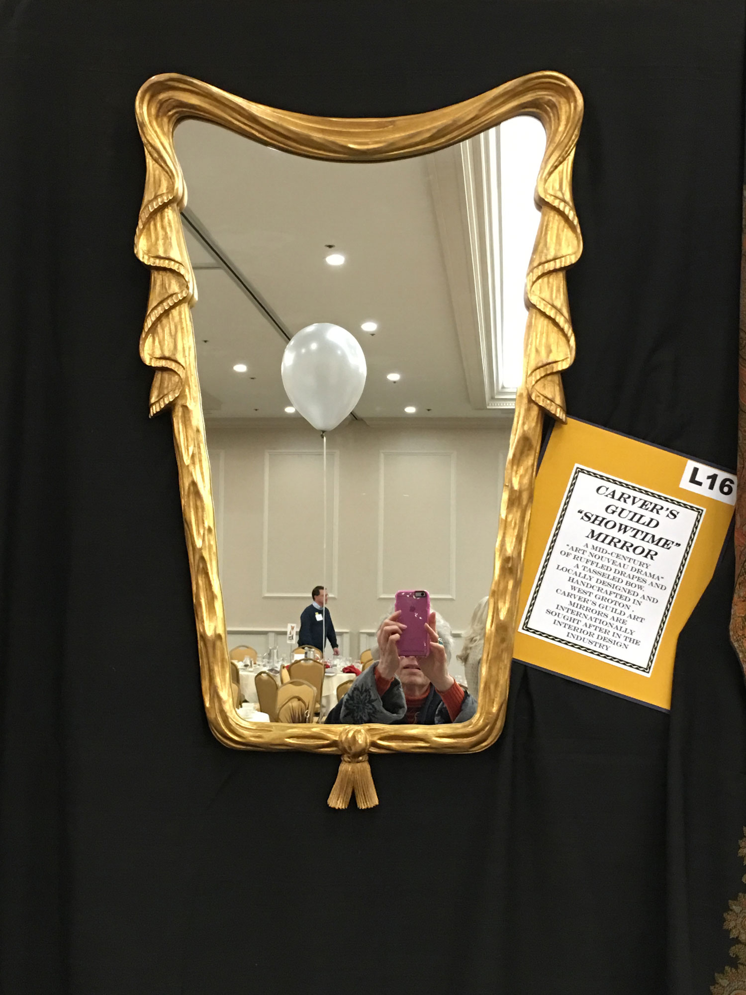 A Mid-Century design of ruffled drapes and a tasseled bow, "Showtime" is an Art Deco drama. Your reflection in this mirror makes you the main actor.