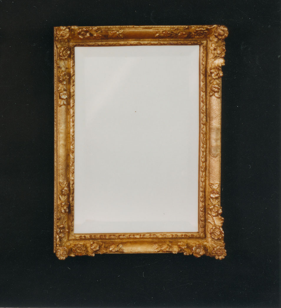 This pretty frame is a petite version of a frame that was very popular in the eitheenth century in France. It is seen widely at Versailles. Shown in Sterling Silver leaf with a Gold Wash and a beveled mirror, also available in Antique Gold Leaf. There is a larger size #4017.