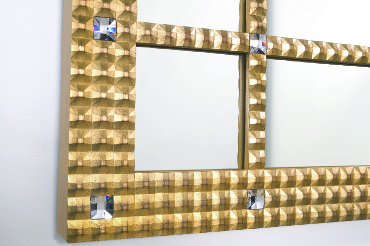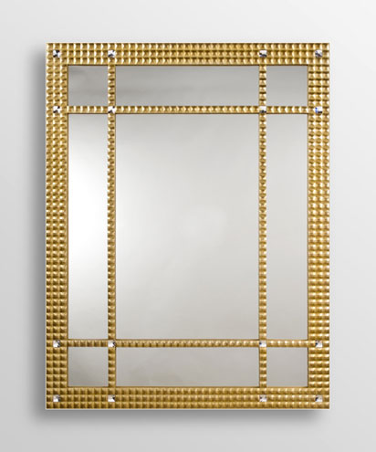 The sophisticated Cartier look of the Fascination Series is created by its crystaline faceted surfaces. The Fascination I has a double fret design inlaid with Swarovski crystals (can be ordered without crystals). The mirrors shown are all beveled but plain may be requested. The Fascination comes finished in Gold leaf as shown, Silver leaf, black or choice of colors. The mirror is a Carol Canner original design.