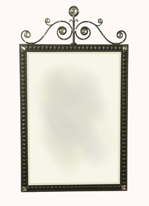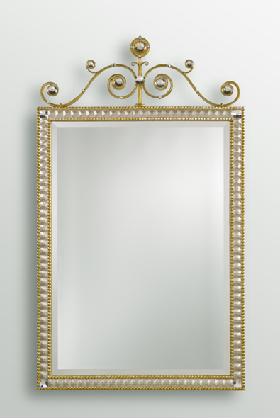 Fascination II is a fanciful repeat inspired by square cut crystals. Brilliant Swarovski crystals are inset into the corners and offered up by the scrolling top like a piece of fine jewelry. Shown in hand-laid antique gold leaf with clear Swarovski Crystals. Designer Carol Canner.