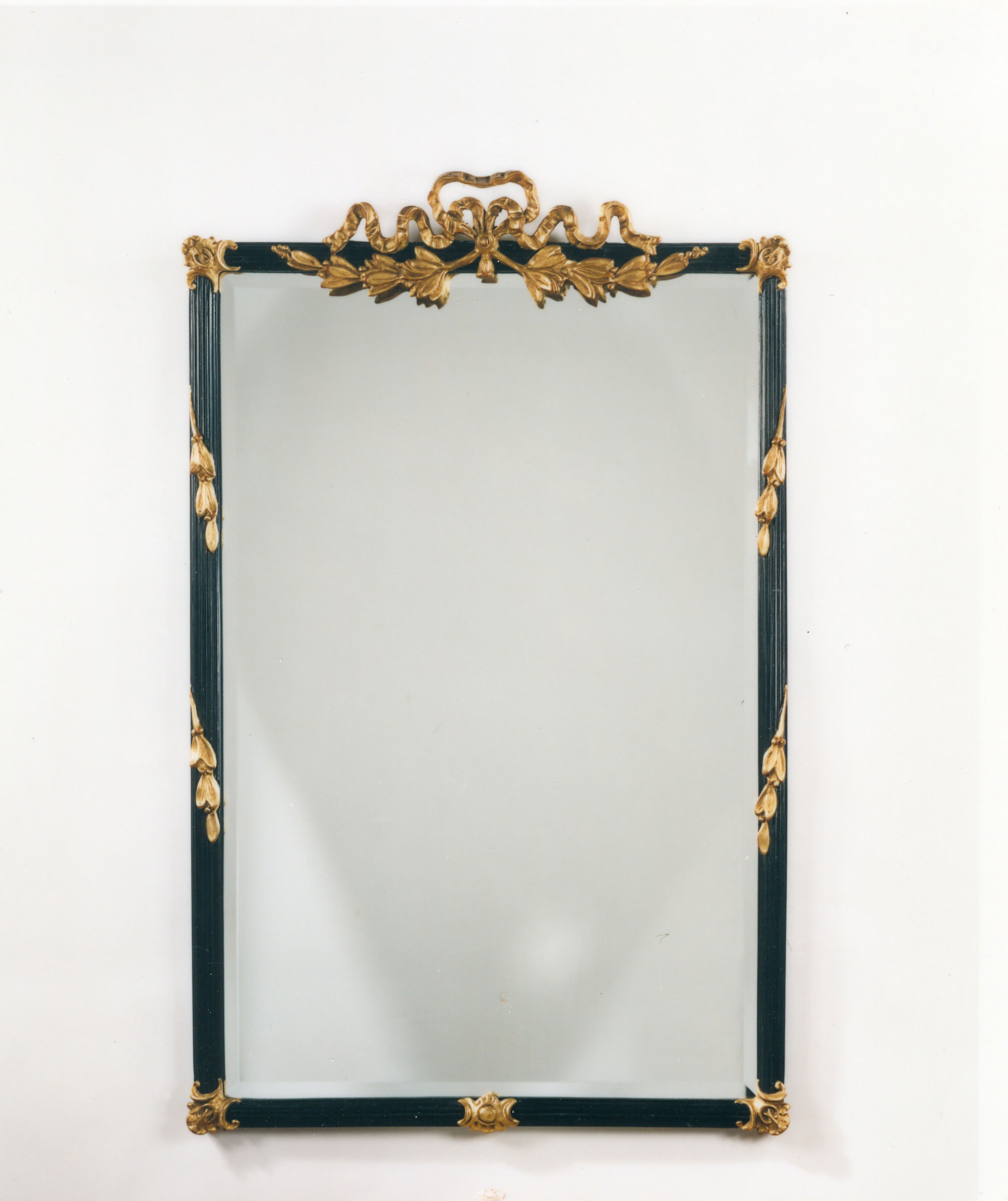 Crowned with an exceptionally charming motif, the Bow Top is an outstanding favorite. This lyrical piece is finished in antique gold leaf and comes with a beveled mirror.