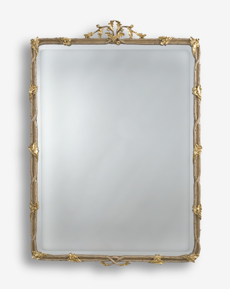 This lovely design has a pleasing flow with rounded corners. Twigs and oak leaves are topped by an oak leaf and acorn crest. Shown in our antique gold leaf finish with a beveled mirror. Also available in a handpainted finish with gold leaf accents.