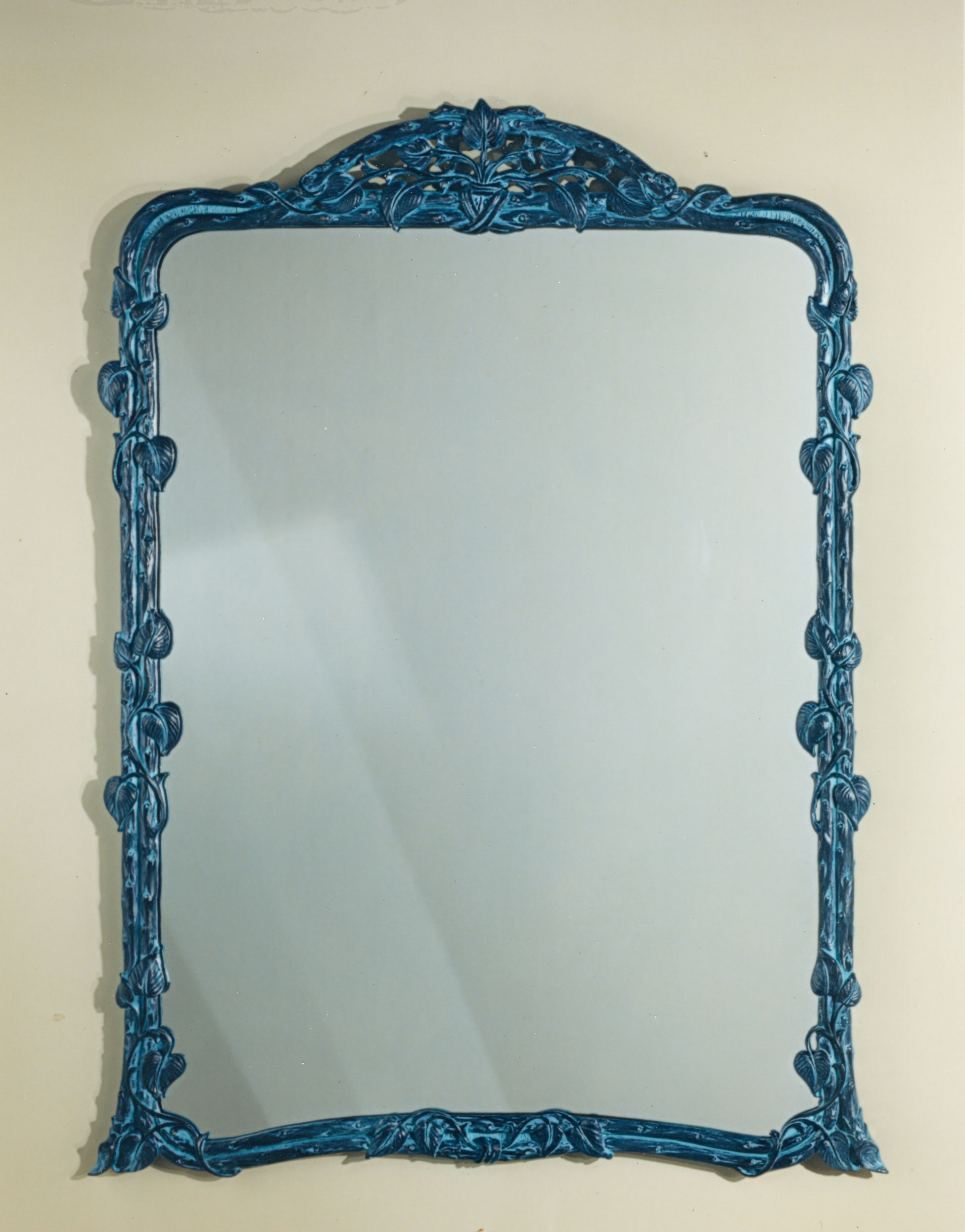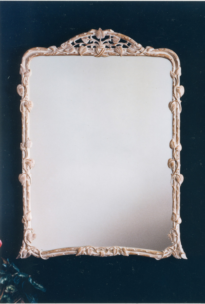 The Twig and Vine is an outstanding Art Nouveau design. The vine, symbol of long life, is used here in a fantasy of sinuous leaves and vines intertwining a decorative twig framework. This frame is available with an optional shaped beveled mirror and a choice of three finishes, verde antique, chalk pine or antique gold leaf.