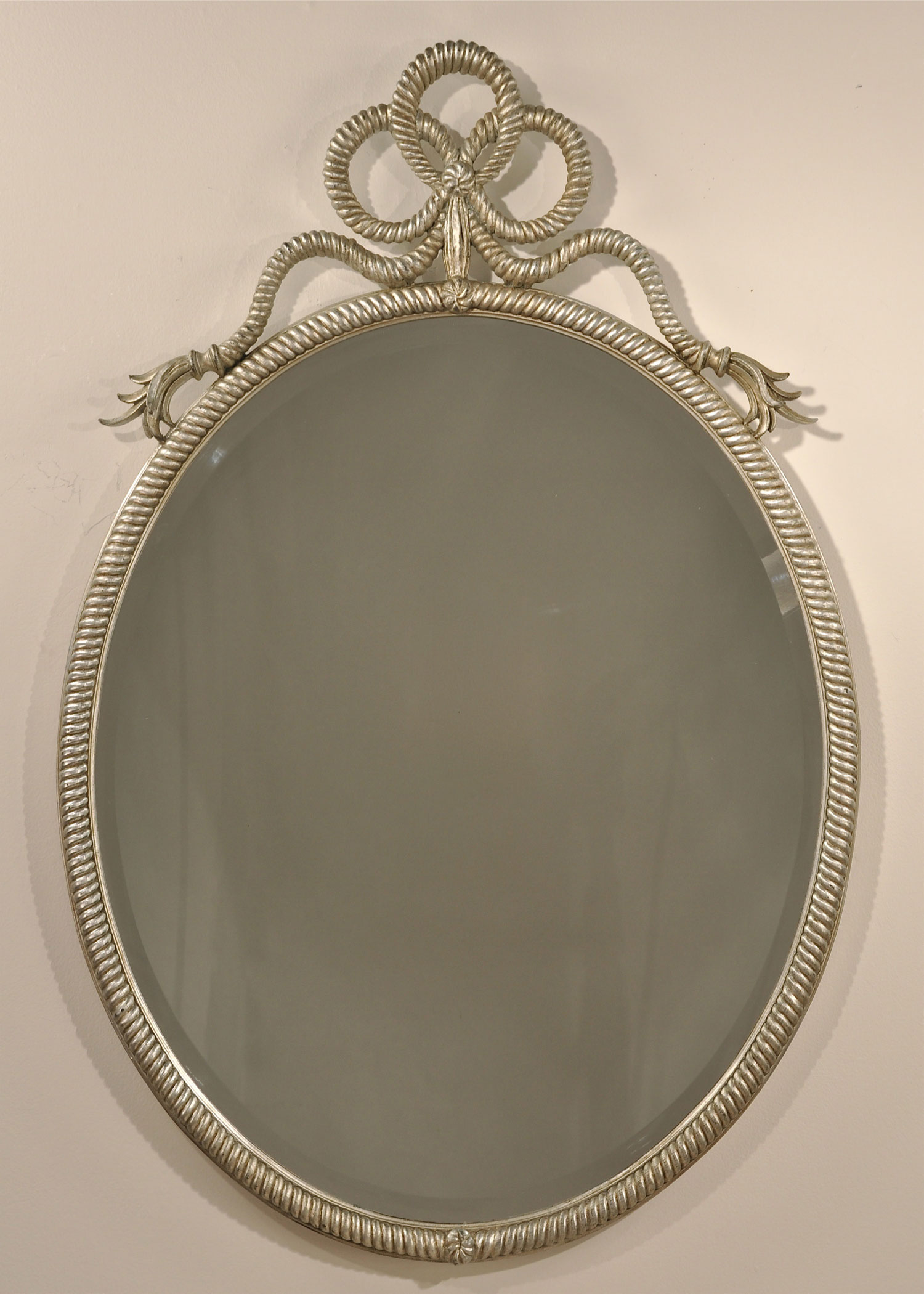 A bold Neo-classic oval with a rope frame crowned with a tasseled bow bound by a knot. This design symbolizes the strength and harmony of eternal love. Shown in antique gold leaf this piece is also available in faux iron for a fresh garden look.